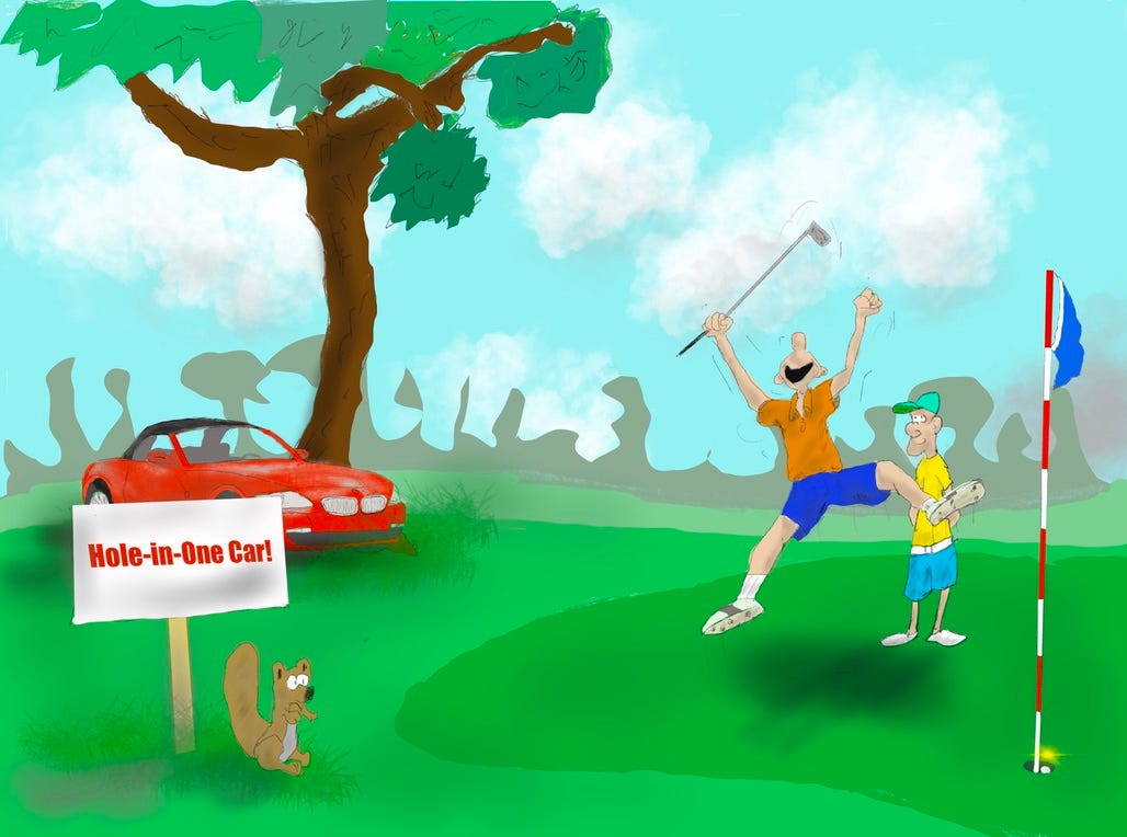 Murgler must see the confusion on this Reporter’s face. He quickly begins connecting the dots for me. "First off, that hole is way too long and difficult for a drunken amateur on a local Monday tournament to even hit the green; let alone have it go in the hole. That's not fair to me, or any other insurance guy. Second, I'm not the guy providing a car. I mean, everybody knows there's only one car in town like it - and it's owned by my friend, Reggie Sputz."